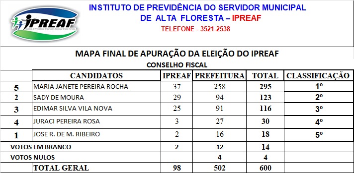 ELEIÇÕES DOS CONSELHOS CURADOR E FISCAL DO IPREAF - RESULTADO FINAL