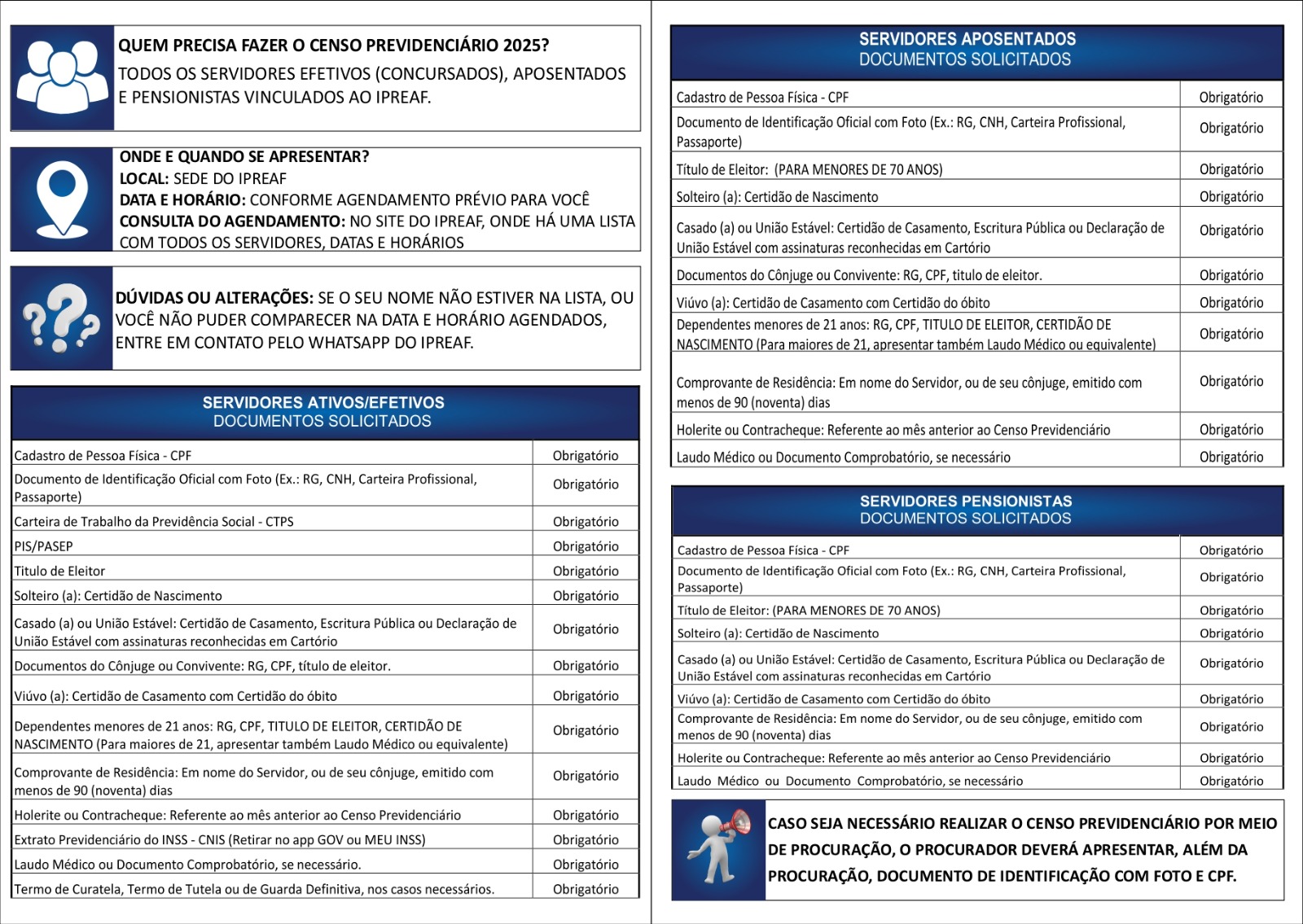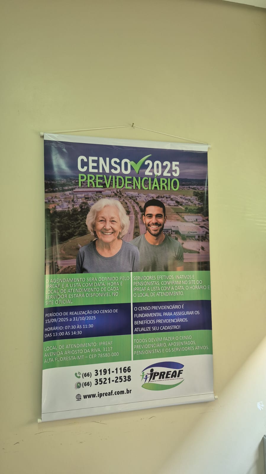 O Instituto de Previdência dos Servidor Municipal de Alta Floresta (IPREAF) concluiu, no dia 31 de outubro de 2025, o Censo Previdenciário 2025, realizado entre 15 de setembro e 31 de outubro, contemplando servidores ativos, aposentados e pensionistas do RPPS.
